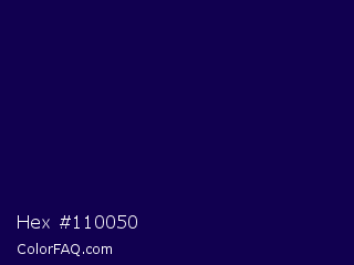 Hex #110050 Color is a very dark indigo color and the nearest color is Tolopea #1b0245. Hex code #110050 and RGB value is rgb(17,0,80). In RGB color space, this color is composed of 7% red, 0% green, 31% blue, In CMYK color space, this color is composed of 79% cyan, 100% magenta, 0% yellow , 69% black , In HSL color space, this color has a hue angle of 253° , 100% saturation and 16% lightness.