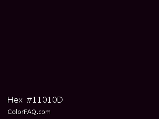 Hex #11010d Color is a almost black magenta color and the nearest color is Jaguar #080110. Hex code #11010d and RGB value is rgb(17,1,13). In RGB color space, this color is composed of 7% red, 0% green, 5% blue, In CMYK color space, this color is composed of 0% cyan, 94% magenta, 24% yellow , 93% black , In HSL color space, this color has a hue angle of 315° , 89% saturation and 4% lightness.