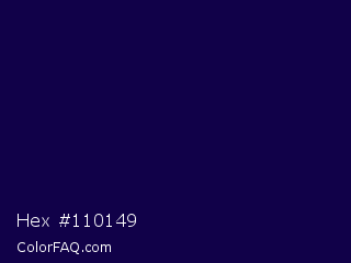 Hex #110149 Color is a very dark indigo color and the nearest color is Tolopea #1b0245. Hex code #110149 and RGB value is rgb(17,1,73). In RGB color space, this color is composed of 7% red, 0% green, 29% blue, In CMYK color space, this color is composed of 77% cyan, 99% magenta, 0% yellow , 71% black , In HSL color space, this color has a hue angle of 253° , 97% saturation and 15% lightness.