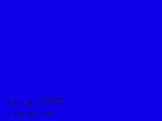 Hex #1101eb Color is a normal indigo color and the nearest color is Blue #0000ff. Hex code #1101eb and RGB value is rgb(17,1,235). In RGB color space, this color is composed of 7% red, 0% green, 92% blue, In CMYK color space, this color is composed of 93% cyan, 100% magenta, 0% yellow , 8% black , In HSL color space, this color has a hue angle of 244° , 99% saturation and 46% lightness.