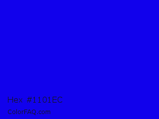 Hex #1101ec Color is a normal indigo color and the nearest color is Blue #0000ff. Hex code #1101ec and RGB value is rgb(17,1,236). In RGB color space, this color is composed of 7% red, 0% green, 93% blue, In CMYK color space, this color is composed of 93% cyan, 100% magenta, 0% yellow , 7% black , In HSL color space, this color has a hue angle of 244° , 99% saturation and 46% lightness.