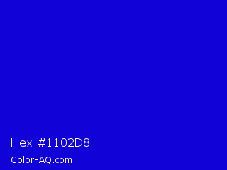 Hex #1102d8 Color is a normal indigo color and the nearest color is Medium Blue #0000cd. Hex code #1102d8 and RGB value is rgb(17,2,216). In RGB color space, this color is composed of 7% red, 1% green, 85% blue, In CMYK color space, this color is composed of 92% cyan, 99% magenta, 0% yellow , 15% black , In HSL color space, this color has a hue angle of 244° , 98% saturation and 43% lightness.
