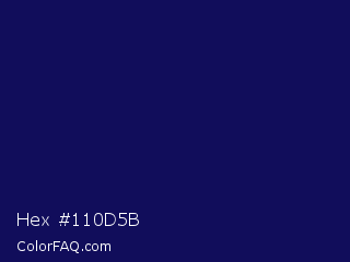 Hex #110d5b Color is a very dark indigo color and the nearest color is Gulf Blue #051657. Hex code #110d5b and RGB value is rgb(17,13,91). In RGB color space, this color is composed of 7% red, 5% green, 36% blue, In CMYK color space, this color is composed of 81% cyan, 86% magenta, 0% yellow , 64% black , In HSL color space, this color has a hue angle of 243° , 75% saturation and 20% lightness.