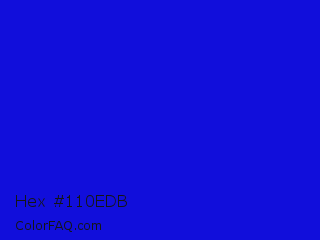 Hex #110edb Color is a normal indigo color and the nearest color is Medium Blue #0000cd. Hex code #110edb and RGB value is rgb(17,14,219). In RGB color space, this color is composed of 7% red, 5% green, 86% blue, In CMYK color space, this color is composed of 92% cyan, 94% magenta, 0% yellow , 14% black , In HSL color space, this color has a hue angle of 241° , 88% saturation and 46% lightness.