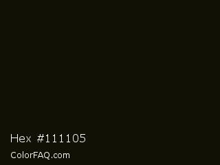Hex #111105 Color is a almost black yellow color and the nearest color is Green Waterloo #101405. Hex code #111105 and RGB value is rgb(17,17,5). In RGB color space, this color is composed of 7% red, 7% green, 2% blue, In CMYK color space, this color is composed of 0% cyan, 0% magenta, 71% yellow , 93% black , In HSL color space, this color has a hue angle of 60° , 55% saturation and 4% lightness.