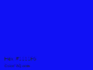 Hex #1111f6 Color is a normal blue color and the nearest color is Bluebonnet #1c1cf0. Hex code #1111f6 and RGB value is rgb(17,17,246). In RGB color space, this color is composed of 7% red, 7% green, 96% blue, In CMYK color space, this color is composed of 93% cyan, 93% magenta, 0% yellow , 4% black , In HSL color space, this color has a hue angle of 240° , 93% saturation and 52% lightness.