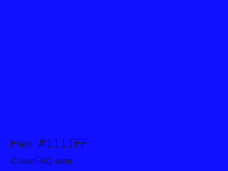 Hex #1111ff Color is a normal blue color and the nearest color is Bluebonnet #1c1cf0. Hex code #1111ff and RGB value is rgb(17,17,255). In RGB color space, this color is composed of 7% red, 7% green, 100% blue, In CMYK color space, this color is composed of 93% cyan, 93% magenta, 0% yellow , 0% black , In HSL color space, this color has a hue angle of 240° , 100% saturation and 53% lightness.