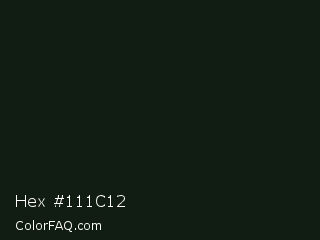 Hex #111c12 Color is a almost black green color and the nearest color is Hunter Green #161d10. Hex code #111c12 and RGB value is rgb(17,28,18). In RGB color space, this color is composed of 7% red, 11% green, 7% blue, In CMYK color space, this color is composed of 39% cyan, 0% magenta, 36% yellow , 89% black , In HSL color space, this color has a hue angle of 125° , 24% saturation and 9% lightness.