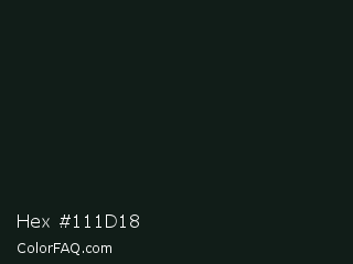 Hex #111d18 Color is a almost black green color and the nearest color is Aztec #0d1c19. Hex code #111d18 and RGB value is rgb(17,29,24). In RGB color space, this color is composed of 7% red, 11% green, 9% blue, In CMYK color space, this color is composed of 41% cyan, 0% magenta, 17% yellow , 89% black , In HSL color space, this color has a hue angle of 155° , 26% saturation and 9% lightness.