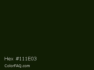 Hex #111e03 Color is a almost black green color and the nearest color is Pine Tree #171f04. Hex code #111e03 and RGB value is rgb(17,30,3). In RGB color space, this color is composed of 7% red, 12% green, 1% blue, In CMYK color space, this color is composed of 43% cyan, 0% magenta, 90% yellow , 88% black , In HSL color space, this color has a hue angle of 89° , 82% saturation and 6% lightness.