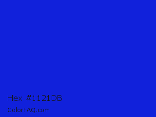 Hex #1121db Color is a normal blue color and the nearest color is Bluebonnet #1c1cf0. Hex code #1121db and RGB value is rgb(17,33,219). In RGB color space, this color is composed of 7% red, 13% green, 86% blue, In CMYK color space, this color is composed of 92% cyan, 85% magenta, 0% yellow , 14% black , In HSL color space, this color has a hue angle of 235° , 86% saturation and 46% lightness.