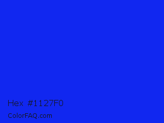 Hex #1127f0 Color is a normal blue color and the nearest color is Bluebonnet #1c1cf0. Hex code #1127f0 and RGB value is rgb(17,39,240). In RGB color space, this color is composed of 7% red, 15% green, 94% blue, In CMYK color space, this color is composed of 93% cyan, 84% magenta, 0% yellow , 6% black , In HSL color space, this color has a hue angle of 234° , 88% saturation and 50% lightness.