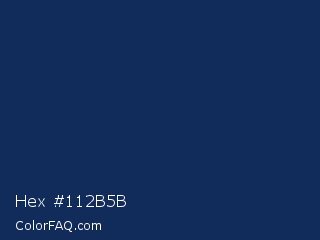 Hex #112b5b Color is a very dark blue color and the nearest color is Madison #09255d. Hex code #112b5b and RGB value is rgb(17,43,91). In RGB color space, this color is composed of 7% red, 17% green, 36% blue, In CMYK color space, this color is composed of 81% cyan, 53% magenta, 0% yellow , 64% black , In HSL color space, this color has a hue angle of 219° , 69% saturation and 21% lightness.