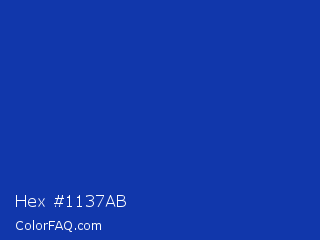 Hex #1137ab Color is a normal blue color and the nearest color is Egyptian Blue #1034a6. Hex code #1137ab and RGB value is rgb(17,55,171). In RGB color space, this color is composed of 7% red, 22% green, 67% blue, In CMYK color space, this color is composed of 90% cyan, 68% magenta, 0% yellow , 33% black , In HSL color space, this color has a hue angle of 225° , 82% saturation and 37% lightness.