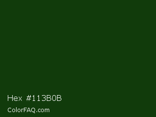 Hex #113b0b Color is a very dark green color and the nearest color is Palm Leaf #19330e. Hex code #113b0b and RGB value is rgb(17,59,11). In RGB color space, this color is composed of 7% red, 23% green, 4% blue, In CMYK color space, this color is composed of 71% cyan, 0% magenta, 81% yellow , 77% black , In HSL color space, this color has a hue angle of 113° , 69% saturation and 14% lightness.