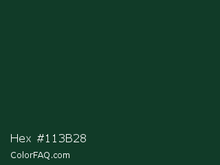 Hex #113b28 Color is a very dark green color and the nearest color is Phthalo Green #123524. Hex code #113b28 and RGB value is rgb(17,59,40). In RGB color space, this color is composed of 7% red, 23% green, 16% blue, In CMYK color space, this color is composed of 71% cyan, 0% magenta, 32% yellow , 77% black , In HSL color space, this color has a hue angle of 153° , 55% saturation and 15% lightness.