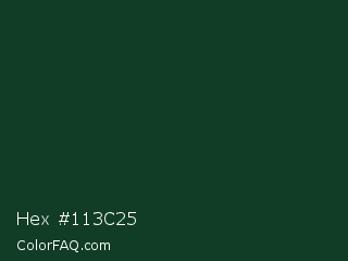 Hex #113c25 Color is a very dark green color and the nearest color is Phthalo Green #123524. Hex code #113c25 and RGB value is rgb(17,60,37). In RGB color space, this color is composed of 7% red, 24% green, 15% blue, In CMYK color space, this color is composed of 72% cyan, 0% magenta, 38% yellow , 76% black , In HSL color space, this color has a hue angle of 148° , 56% saturation and 15% lightness.