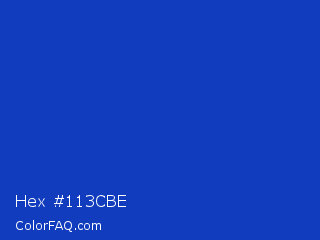 Hex #113cbe Color is a normal blue color and the nearest color is Persian Blue #1c39bb. Hex code #113cbe and RGB value is rgb(17,60,190). In RGB color space, this color is composed of 7% red, 24% green, 75% blue, In CMYK color space, this color is composed of 91% cyan, 68% magenta, 0% yellow , 25% black , In HSL color space, this color has a hue angle of 225° , 84% saturation and 41% lightness.
