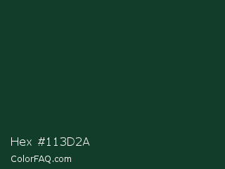 Hex #113d2a Color is a very dark green color and the nearest color is Phthalo Green #123524. Hex code #113d2a and RGB value is rgb(17,61,42). In RGB color space, this color is composed of 7% red, 24% green, 16% blue, In CMYK color space, this color is composed of 72% cyan, 0% magenta, 31% yellow , 76% black , In HSL color space, this color has a hue angle of 154° , 56% saturation and 15% lightness.