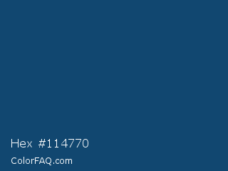 Hex #114770 Color is a dark blue color and the nearest color is Dark Cerulean #08457e. Hex code #114770 and RGB value is rgb(17,71,112). In RGB color space, this color is composed of 7% red, 28% green, 44% blue, In CMYK color space, this color is composed of 85% cyan, 37% magenta, 0% yellow , 56% black , In HSL color space, this color has a hue angle of 206° , 74% saturation and 25% lightness.