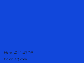 Hex #1147db Color is a normal blue color and the nearest color is Palatinate Blue #273be2. Hex code #1147db and RGB value is rgb(17,71,219). In RGB color space, this color is composed of 7% red, 28% green, 86% blue, In CMYK color space, this color is composed of 92% cyan, 68% magenta, 0% yellow , 14% black , In HSL color space, this color has a hue angle of 224° , 86% saturation and 46% lightness.