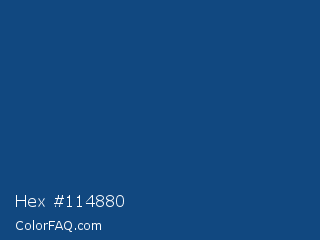 Hex #114880 Color is a dark blue color and the nearest color is Dark Cerulean #08457e. Hex code #114880 and RGB value is rgb(17,72,128). In RGB color space, this color is composed of 7% red, 28% green, 50% blue, In CMYK color space, this color is composed of 87% cyan, 44% magenta, 0% yellow , 50% black , In HSL color space, this color has a hue angle of 210° , 77% saturation and 28% lightness.