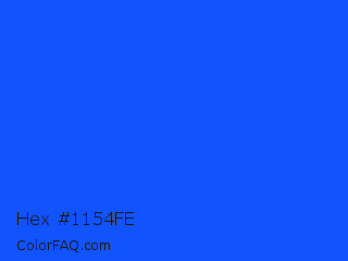 Hex #1154fe Color is a normal blue color and the nearest color is Blue RYB #0247fe. Hex code #1154fe and RGB value is rgb(17,84,254). In RGB color space, this color is composed of 7% red, 33% green, 100% blue, In CMYK color space, this color is composed of 93% cyan, 67% magenta, 0% yellow , 0% black , In HSL color space, this color has a hue angle of 223° , 99% saturation and 53% lightness.