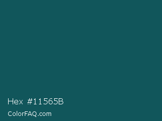 Hex #11565b Color is a very dark cyan color and the nearest color is Deep Sea Green #095859. Hex code #11565b and RGB value is rgb(17,86,91). In RGB color space, this color is composed of 7% red, 34% green, 36% blue, In CMYK color space, this color is composed of 81% cyan, 5% magenta, 0% yellow , 64% black , In HSL color space, this color has a hue angle of 184° , 69% saturation and 21% lightness.
