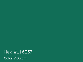 Hex #116e57 Color is a dark cyan color and the nearest color is Watercourse #056f57. Hex code #116e57 and RGB value is rgb(17,110,87). In RGB color space, this color is composed of 7% red, 43% green, 34% blue, In CMYK color space, this color is composed of 85% cyan, 0% magenta, 21% yellow , 57% black , In HSL color space, this color has a hue angle of 165° , 73% saturation and 25% lightness.