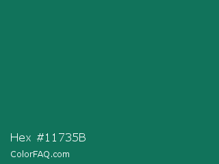 Hex #11735b Color is a dark cyan color and the nearest color is Deep Green Cyan Turquoise #0e7c61. Hex code #11735b and RGB value is rgb(17,115,91). In RGB color space, this color is composed of 7% red, 45% green, 36% blue, In CMYK color space, this color is composed of 85% cyan, 0% magenta, 21% yellow , 55% black , In HSL color space, this color has a hue angle of 165° , 74% saturation and 26% lightness.