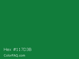 Hex #117d3b Color is a dark green color and the nearest color is La Salle Green #087830. Hex code #117d3b and RGB value is rgb(17,125,59). In RGB color space, this color is composed of 7% red, 49% green, 23% blue, In CMYK color space, this color is composed of 86% cyan, 0% magenta, 53% yellow , 51% black , In HSL color space, this color has a hue angle of 143° , 76% saturation and 28% lightness.
