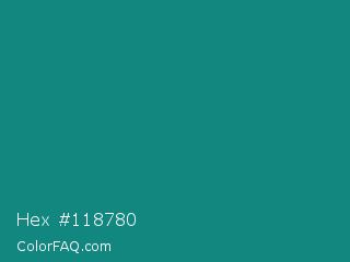 Hex #118780 Color is a dark cyan color and the nearest color is Surfie Green #0c7a79. Hex code #118780 and RGB value is rgb(17,135,128). In RGB color space, this color is composed of 7% red, 53% green, 50% blue, In CMYK color space, this color is composed of 87% cyan, 0% magenta, 5% yellow , 47% black , In HSL color space, this color has a hue angle of 176° , 78% saturation and 30% lightness.