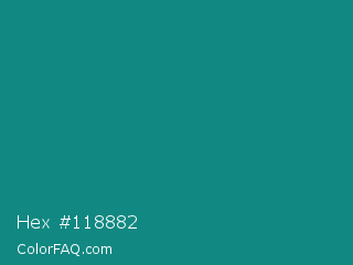 Hex #118882 Color is a dark cyan color and the nearest color is Blue Chill #0c8990. Hex code #118882 and RGB value is rgb(17,136,130). In RGB color space, this color is composed of 7% red, 53% green, 51% blue, In CMYK color space, this color is composed of 88% cyan, 0% magenta, 4% yellow , 47% black , In HSL color space, this color has a hue angle of 177° , 78% saturation and 30% lightness.