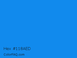Hex #118aed Color is a normal blue color and the nearest color is Dodger Blue #1e90ff. Hex code #118aed and RGB value is rgb(17,138,237). In RGB color space, this color is composed of 7% red, 54% green, 93% blue, In CMYK color space, this color is composed of 93% cyan, 42% magenta, 0% yellow , 7% black , In HSL color space, this color has a hue angle of 207° , 87% saturation and 50% lightness.