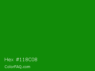 Hex #118c08 Color is a dark green color and the nearest color is India Green #138808. Hex code #118c08 and RGB value is rgb(17,140,8). In RGB color space, this color is composed of 7% red, 55% green, 3% blue, In CMYK color space, this color is composed of 88% cyan, 0% magenta, 94% yellow , 45% black , In HSL color space, this color has a hue angle of 116° , 89% saturation and 29% lightness.