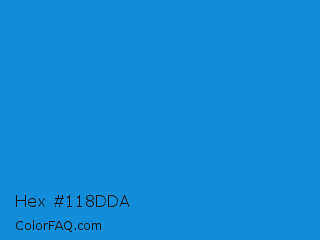 Hex #118dda Color is a normal blue color and the nearest color is Rich Electric Blue #0892d0. Hex code #118dda and RGB value is rgb(17,141,218). In RGB color space, this color is composed of 7% red, 55% green, 85% blue, In CMYK color space, this color is composed of 92% cyan, 35% magenta, 0% yellow , 15% black , In HSL color space, this color has a hue angle of 203° , 86% saturation and 46% lightness.