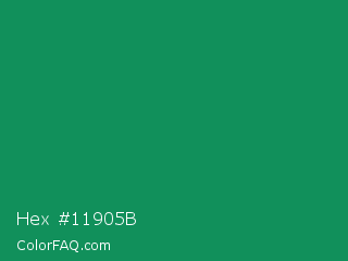 Hex #11905b Color is a normal green color and the nearest color is Spanish Green #009150. Hex code #11905b and RGB value is rgb(17,144,91). In RGB color space, this color is composed of 7% red, 56% green, 36% blue, In CMYK color space, this color is composed of 88% cyan, 0% magenta, 37% yellow , 44% black , In HSL color space, this color has a hue angle of 155° , 79% saturation and 32% lightness.