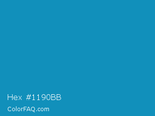 Hex #1190bb Color is a normal blue color and the nearest color is Blue Green #0d98ba. Hex code #1190bb and RGB value is rgb(17,144,187). In RGB color space, this color is composed of 7% red, 56% green, 73% blue, In CMYK color space, this color is composed of 91% cyan, 23% magenta, 0% yellow , 27% black , In HSL color space, this color has a hue angle of 195° , 83% saturation and 40% lightness.