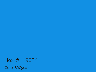Hex #1190e4 Color is a normal blue color and the nearest color is Rich Electric Blue #0892d0. Hex code #1190e4 and RGB value is rgb(17,144,228). In RGB color space, this color is composed of 7% red, 56% green, 89% blue, In CMYK color space, this color is composed of 93% cyan, 37% magenta, 0% yellow , 11% black , In HSL color space, this color has a hue angle of 204° , 86% saturation and 48% lightness.