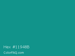 Hex #11948b Color is a normal cyan color and the nearest color is Blue Chill #0c8990. Hex code #11948b and RGB value is rgb(17,148,139). In RGB color space, this color is composed of 7% red, 58% green, 55% blue, In CMYK color space, this color is composed of 89% cyan, 0% magenta, 6% yellow , 42% black , In HSL color space, this color has a hue angle of 176° , 79% saturation and 32% lightness.