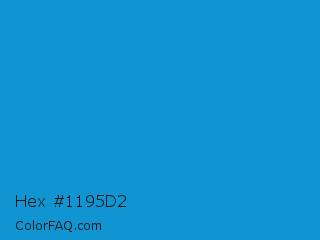 Hex #1195d2 Color is a normal blue color and the nearest color is Rich Electric Blue #0892d0. Hex code #1195d2 and RGB value is rgb(17,149,210). In RGB color space, this color is composed of 7% red, 58% green, 82% blue, In CMYK color space, this color is composed of 92% cyan, 29% magenta, 0% yellow , 18% black , In HSL color space, this color has a hue angle of 199° , 85% saturation and 45% lightness.
