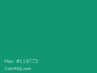 Hex #119773 Color is a normal cyan color and the nearest color is Gossamer #069b81. Hex code #119773 and RGB value is rgb(17,151,115). In RGB color space, this color is composed of 7% red, 59% green, 45% blue, In CMYK color space, this color is composed of 89% cyan, 0% magenta, 24% yellow , 41% black , In HSL color space, this color has a hue angle of 164° , 80% saturation and 33% lightness.