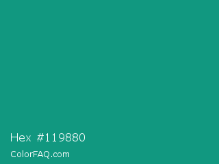 Hex #119880 Color is a normal cyan color and the nearest color is Gossamer #069b81. Hex code #119880 and RGB value is rgb(17,152,128). In RGB color space, this color is composed of 7% red, 60% green, 50% blue, In CMYK color space, this color is composed of 89% cyan, 0% magenta, 16% yellow , 40% black , In HSL color space, this color has a hue angle of 169° , 80% saturation and 33% lightness.