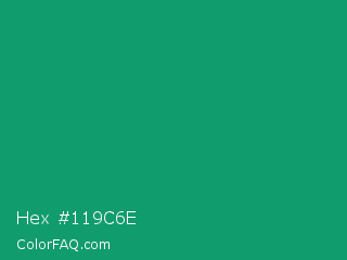 Hex #119c6e Color is a normal green color and the nearest color is Green NCS #009f6b. Hex code #119c6e and RGB value is rgb(17,156,110). In RGB color space, this color is composed of 7% red, 61% green, 43% blue, In CMYK color space, this color is composed of 89% cyan, 0% magenta, 29% yellow , 39% black , In HSL color space, this color has a hue angle of 160° , 80% saturation and 34% lightness.
