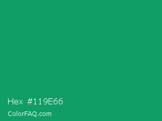 Hex #119e66 Color is a normal green color and the nearest color is Green Haze #01a368. Hex code #119e66 and RGB value is rgb(17,158,102). In RGB color space, this color is composed of 7% red, 62% green, 40% blue, In CMYK color space, this color is composed of 89% cyan, 0% magenta, 35% yellow , 38% black , In HSL color space, this color has a hue angle of 156° , 81% saturation and 34% lightness.