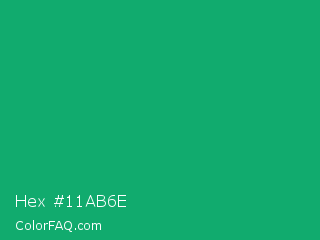 Hex #11ab6e Color is a normal green color and the nearest color is Green Crayola #1cac78. Hex code #11ab6e and RGB value is rgb(17,171,110). In RGB color space, this color is composed of 7% red, 67% green, 43% blue, In CMYK color space, this color is composed of 90% cyan, 0% magenta, 36% yellow , 33% black , In HSL color space, this color has a hue angle of 156° , 82% saturation and 37% lightness.