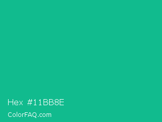 Hex #11bb8e Color is a normal cyan color and the nearest color is Mountain Meadow Crayola #1ab385. Hex code #11bb8e and RGB value is rgb(17,187,142). In RGB color space, this color is composed of 7% red, 73% green, 56% blue, In CMYK color space, this color is composed of 91% cyan, 0% magenta, 24% yellow , 27% black , In HSL color space, this color has a hue angle of 164° , 83% saturation and 40% lightness.