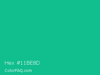 Hex #11be8d Color is a normal green color and the nearest color is Mountain Meadow Crayola #1ab385. Hex code #11be8d and RGB value is rgb(17,190,141). In RGB color space, this color is composed of 7% red, 75% green, 55% blue, In CMYK color space, this color is composed of 91% cyan, 0% magenta, 26% yellow , 25% black , In HSL color space, this color has a hue angle of 163° , 84% saturation and 41% lightness.