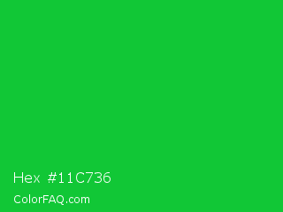 Hex #11c736 Color is a normal green color and the nearest color is Dark Pastel Green #03c03c. Hex code #11c736 and RGB value is rgb(17,199,54). In RGB color space, this color is composed of 7% red, 78% green, 21% blue, In CMYK color space, this color is composed of 91% cyan, 0% magenta, 73% yellow , 22% black , In HSL color space, this color has a hue angle of 132° , 84% saturation and 42% lightness.