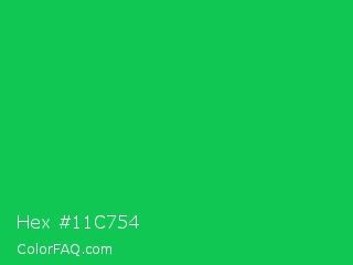 Hex #11c754 Color is a normal green color and the nearest color is Malachite #0bda51. Hex code #11c754 and RGB value is rgb(17,199,84). In RGB color space, this color is composed of 7% red, 78% green, 33% blue, In CMYK color space, this color is composed of 91% cyan, 0% magenta, 58% yellow , 22% black , In HSL color space, this color has a hue angle of 142° , 84% saturation and 42% lightness.